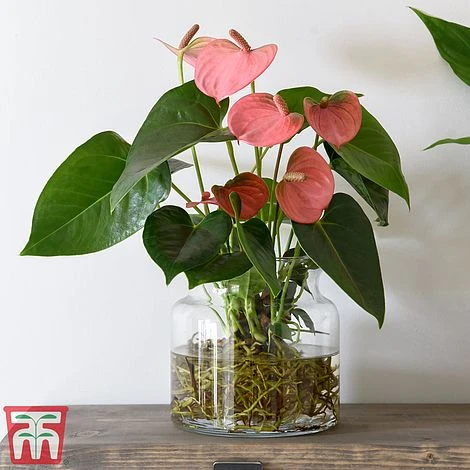 Simple and stylish, this elegant Anthurium comes in a clear glass vase, allowing you to admire its twining network of roots. This eye-catching soiless display makes a fascinating focal point that captures the latest trend for hydroponic house plants. This bareroot Anthurium is easy to grow – simply unpack the plant when it arrives and just add water! With its glossy evergreen foliage and showy pink flowers, this beautiful perennial makes a sophisticated gift that will last far longer than a bouquet of cut flowers. Height and spread: 45cm (18″).