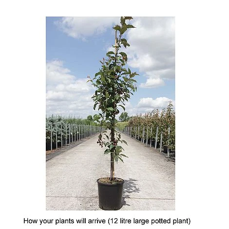 A compact, upright tree with pink buds that open to form attractive white flowers, followed in autumn by bunches of red, conical fruits, lasting all winter long, providing food for wildlife. In spring, foliage appears a glossy mahogany-red, turning dark green in summer, then yellow in autumn. Malus ‘Red Obelisk’ is an excellent performer in any garden, providing show-stopping colour over several seasons. The obelisk apples are also great for making crab apple jelly. Height: 4m (13′). Spread: 1.8m (6′).