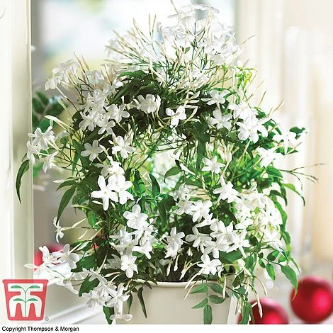 Why not bring one of nature’s most evocative perfumes into the home with Jasmine on a Hoop? This delightful plant has been artfully coaxed onto a circular frame to create a wreath of green impact and structure. Delicate pink buds open into pure white, fragrant flowers, covering lush green foliage.