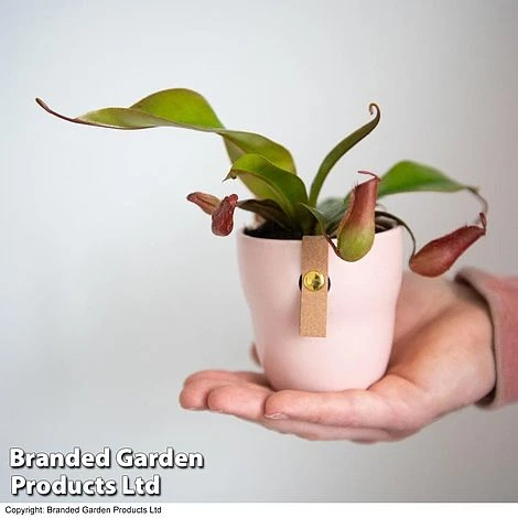 A native of tropical rainforests, these wacky pitcher plants are a botanical curiosity which is bound to draw attention and make an unusual feature for a hanging planter. Also known by the name ‘monkey cups’, it was once thought that monkeys drunk water from their pitchers! The pitchers hang down from tendrils growing from the leaf tips and are full of digestive juices. Insects are attracted by sweet-smelling nectar within the lid of the pitcher and then lose their footing on its slippery lips, tumbling down into the pool of digestive juices below. Nepenthes ‘Blood Red’ has especially eye-catching pitchers, bi-coloured red and pale green. Colouration is varied throughout the season. Height: 40cm (16”). Spread: 30cm (12”).