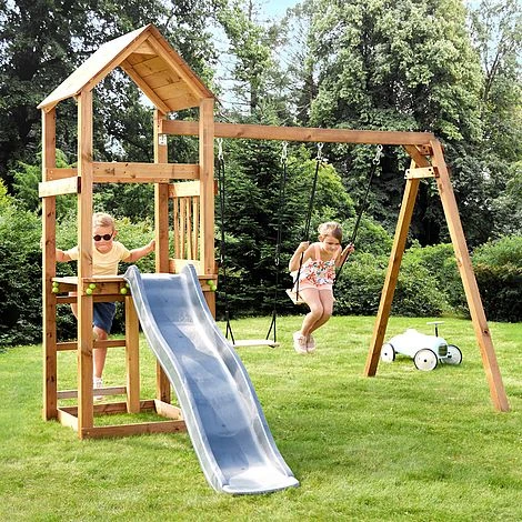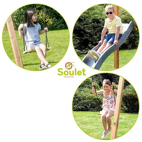 A large and impressive outdoor play apparatus perfect for kids of all ages, the Noumea playground is ambitious and impressive. The Noumea playground has two wooden swings, a play tower with access to a slide made of up to 80% recycled plastic, and space for up to 7 kids. It’s made to be demanding fun for everyone. The wood used has been pressure treated to prevent mold and mildew, and the design was thoughtfully created with our Objectif Nature collection in mind.