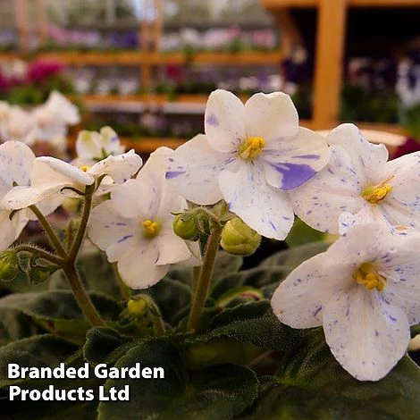 Saintpaulia ‘Tina’s April Fantasy’ has glistening white flowers splattered with random blue splashes which look just as though they have been flicked off an artist’s paint brush.