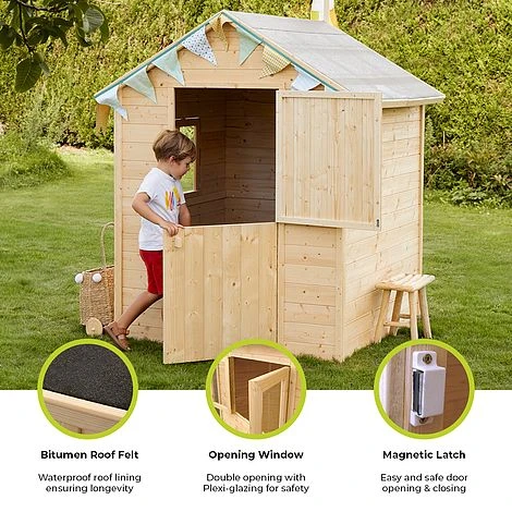 The Grace Wooden Hut provides kids with a cozy, conventional play area that is built to last. The Grace Wooden Hut is equipped with features like a plexi glass window, magnetic closures on the farmhouse door, and a double sloped roof to ensure the protection of its 1,35m2 of play space. Its measurements have been meticulously revised, with thicker floorboards and a height of 160 cm for a door that is 126 cm wide. The Grace Wooden Hut can be easily modified to meet the requirements of any child, whether it is in a small or large garden.