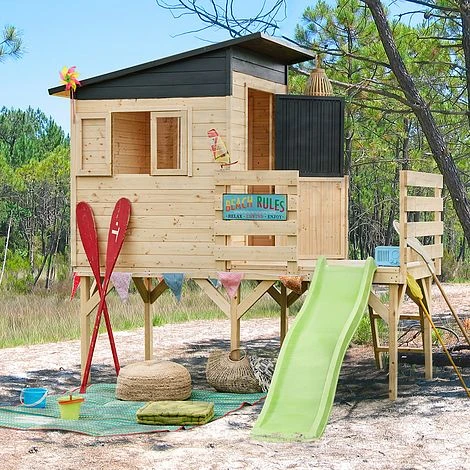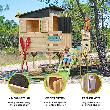 The Portland House, a special take on the Beach Hut on stilts, will add excitement to your garden. Thanks to the guardrail that encircles the outdoor patio, you can safely play while experiencing the rush of a 90 cm (3 foot) elevation. Let your kids have fun with the slide, the ladder, and plenty of room for outdoor adventures as they explore their creativity over 7.30m2 (including 1.35m2 inside)! Put this beach hut on stilts in your garden right away to give your kids access to the great outdoors in a natural setting.